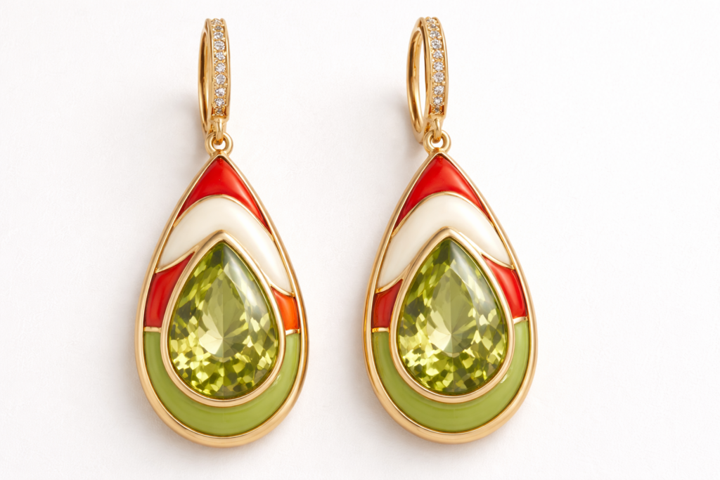 These earrings are inspired by the completo italiano, a Chilean hot dog topped with avocado, tomato, and mayonnaise. The dish is defined by its clear color contrast, soft textures, and layered assembly. These characteristics informed the jewellery design directly: avocado-green gemstones, tomato-red enamel accents, and ivory-white details are arranged in distinct layers that mirror the dish’s visual structure. The completo italiano is typically assembled fresh, with ingredients added in a fixed order to maintain balance and clarity.