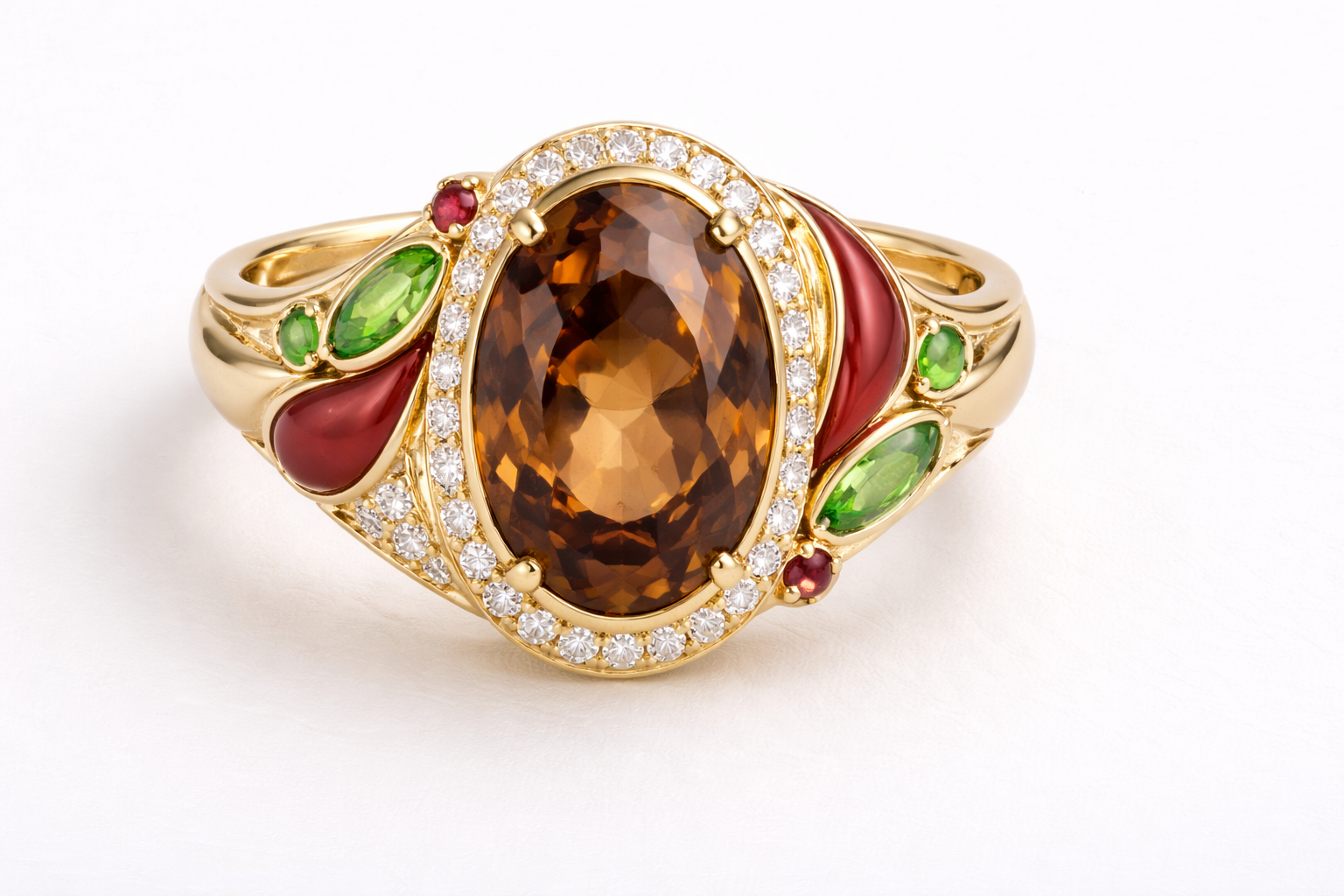 Leaves inspired by the araucária and banana tree frame the piece, grounding it in Brazil’s rich landscapes. Feather-like details reference the arara-azul, echoing freedom, movement, and colour.