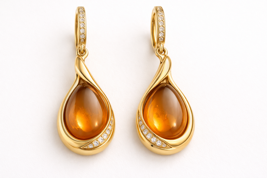 These earrings are inspired by manjar, a caramel spread made by slowly cooking milk and sugar until thick and glossy. Manjar is widely used in Chilean pastries and desserts and is recognized for its warm golden-brown color and smooth, flowing consistency. These characteristics informed the jewellery design directly: caramel-gold gemstones reference the finished spread, while soft curved forms mirror its fluid texture. Manjar is typically prepared through long, controlled heating, which influenced the emphasis on polished surfaces and continuous lines.