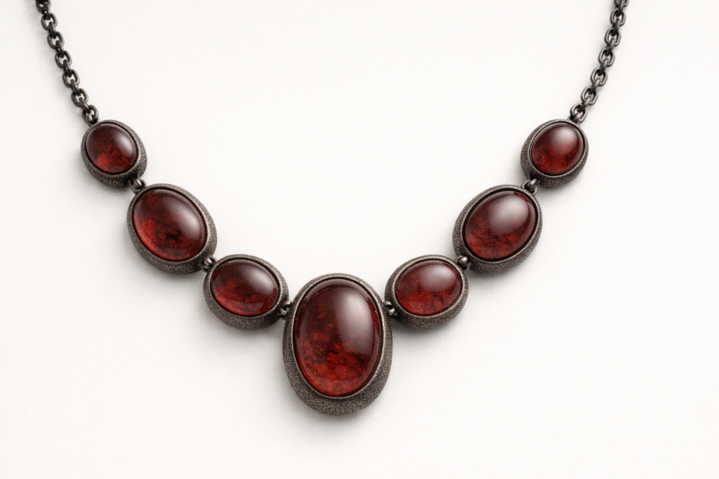 This necklace is inspired by merquén, a traditional Chilean spice made from smoked and dried chili peppers, coriander seeds, and salt. Merquén is known for its deep red color, fine granular texture, and smoky heat. These characteristics informed the jewellery design: smoked-red gemstones reflect the chili’s color, darkened metal mirrors the roasting process, and subtle surface texture references the spice’s ground form. Merquén is traditionally produced by sun-drying and smoking peppers before grinding, a process that informed the layered and textured material choices.