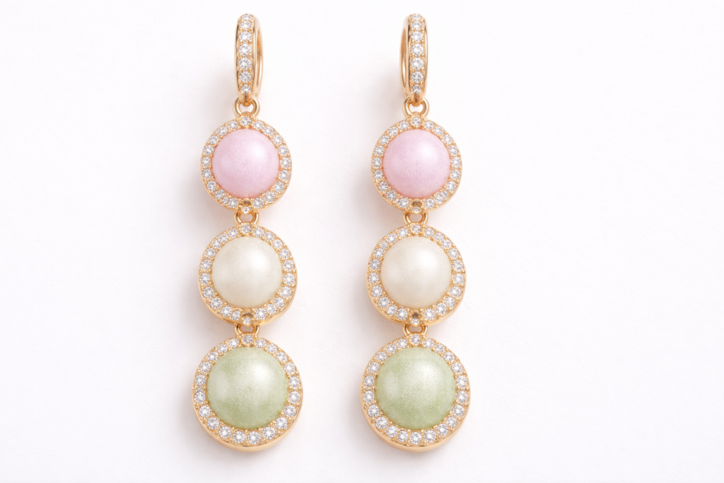 These earrings are inspired by Taiwanese mochi, a rice-based dessert known for its soft exterior, rounded shape, and lightly powdered surface. Mochi typically appears in pale tones such as white, pink, and green, depending on filling and coating. These qualities informed the jewellery design directly: smooth rounded elements reflect the dessert’s shape, while matte enamel finishes reference its starch-dusted surface. Mochi is prepared by steaming glutinous rice dough and shaping it by hand before coating, a process that emphasizes surface softness and uniformity.